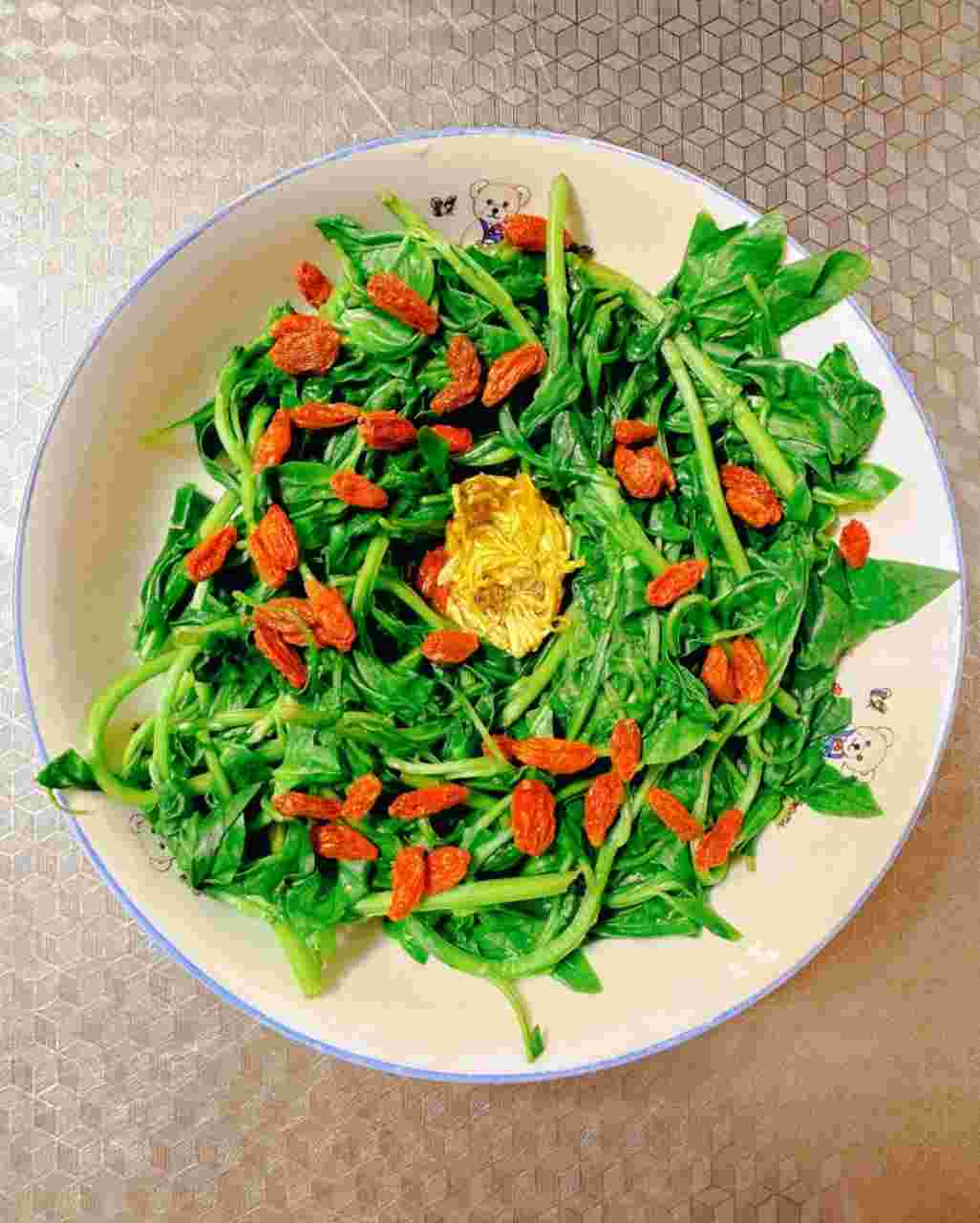 嫩枸杞叶 125g,枸杞 适量,金丝皇菊 1朵,盐 1小勺,白醋 几滴